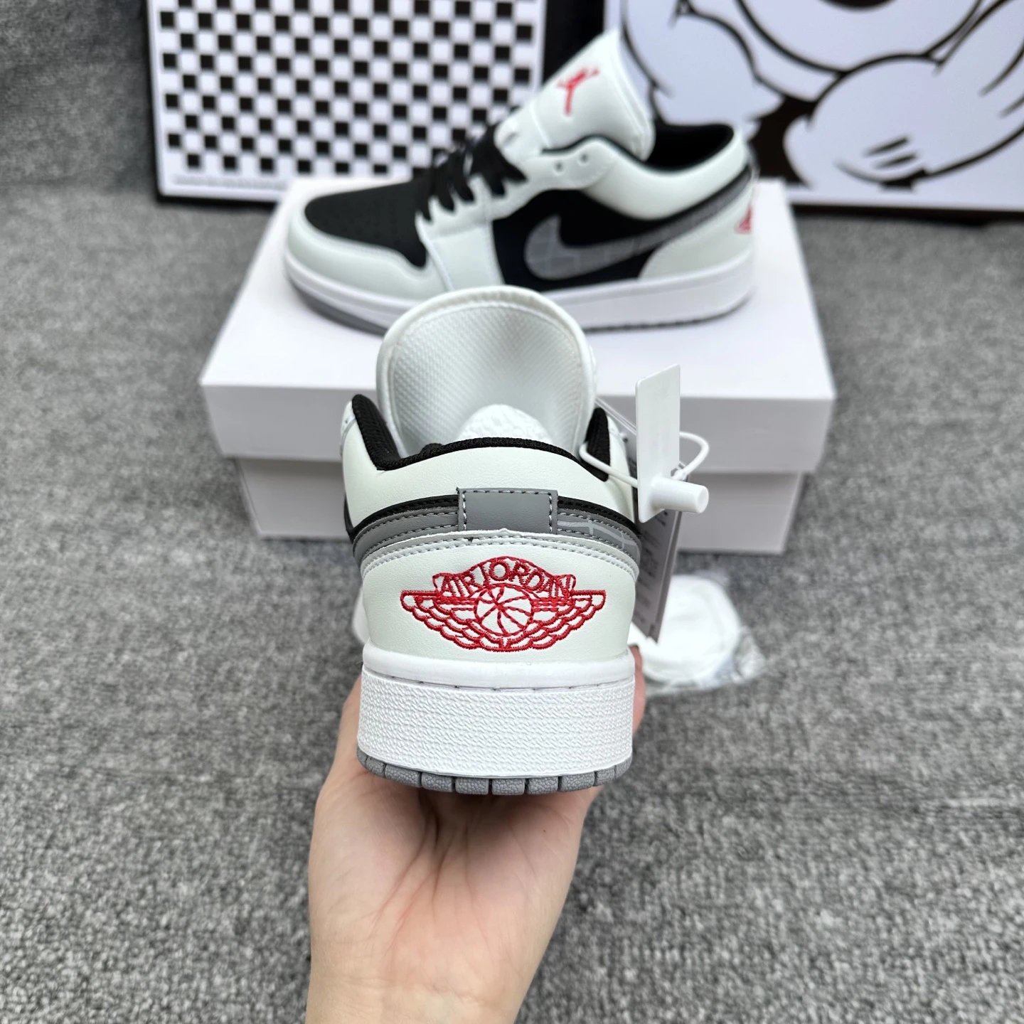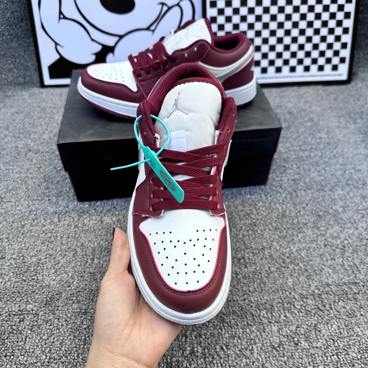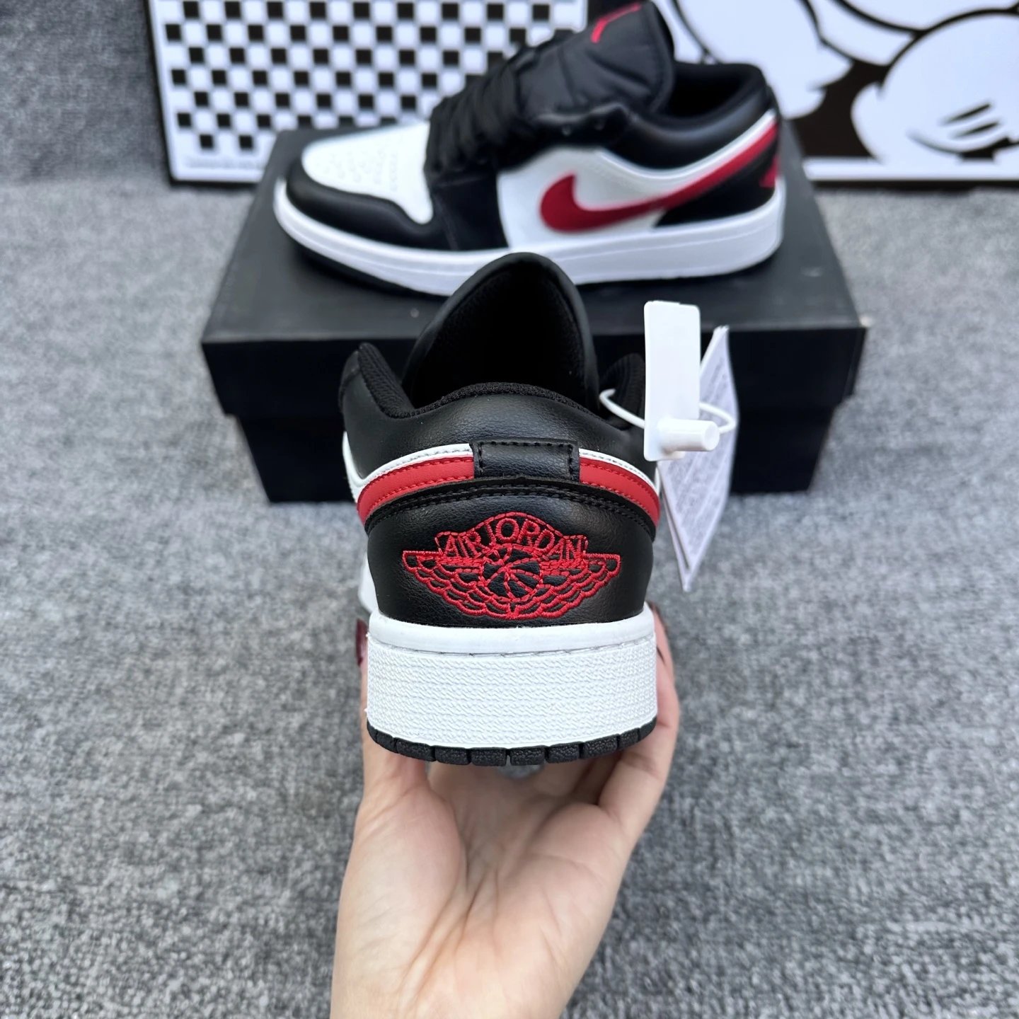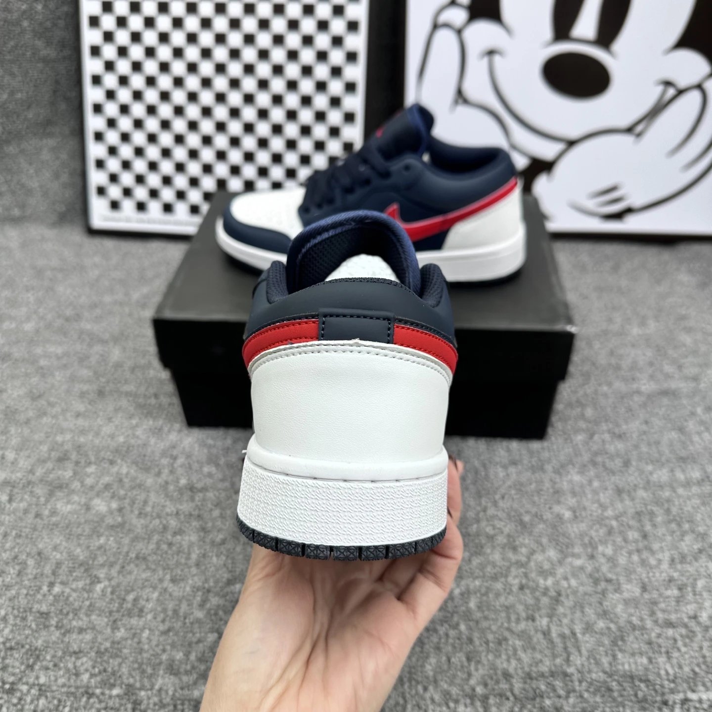 Example: Take photos of the logo, check stitching quality, measure the insole length, etc.