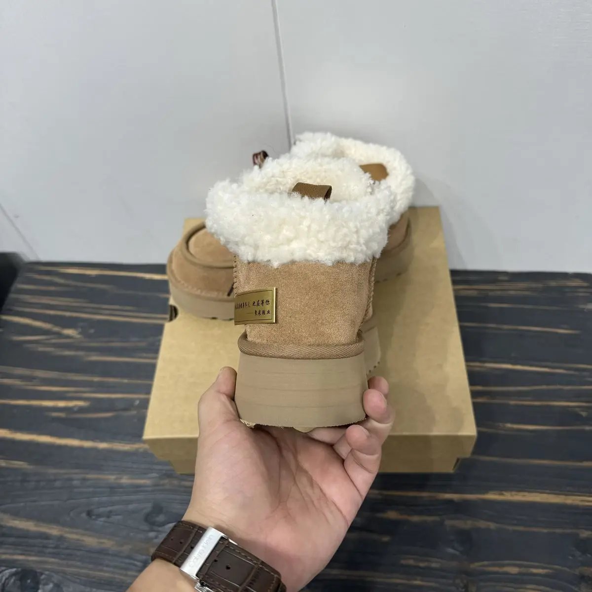 Example: Take photos of the logo, check stitching quality, measure the insole length, etc.