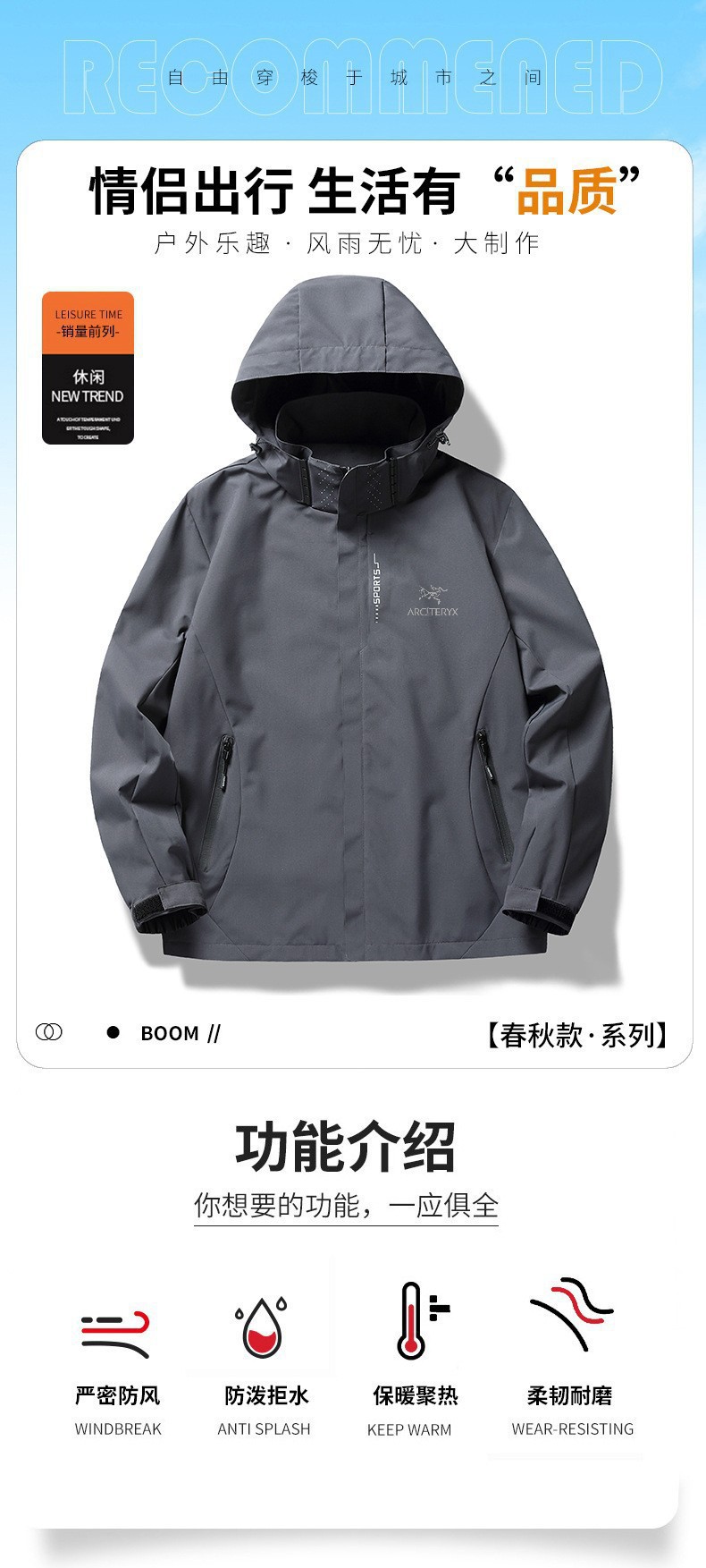 男女运动户外薄款轻壳鸟家冲锋衣连帽防水防风外套登山露营三防服