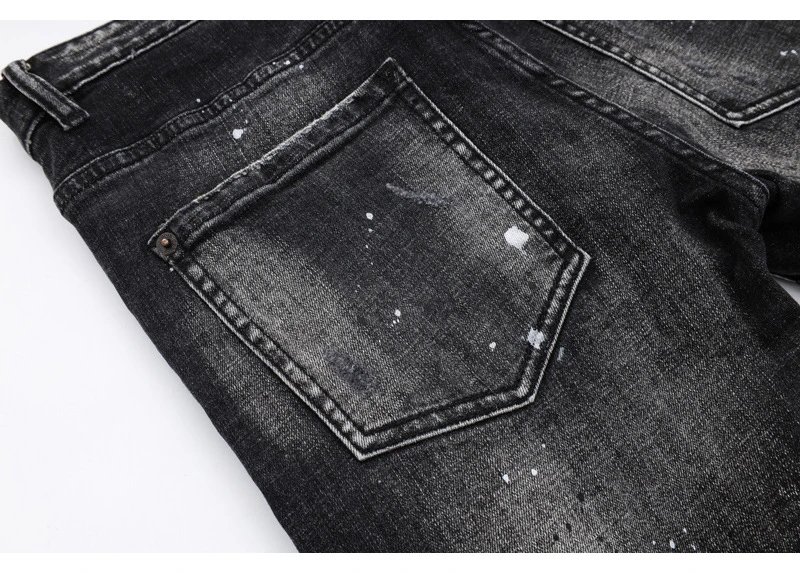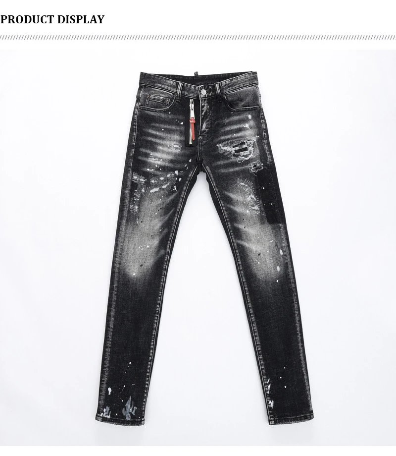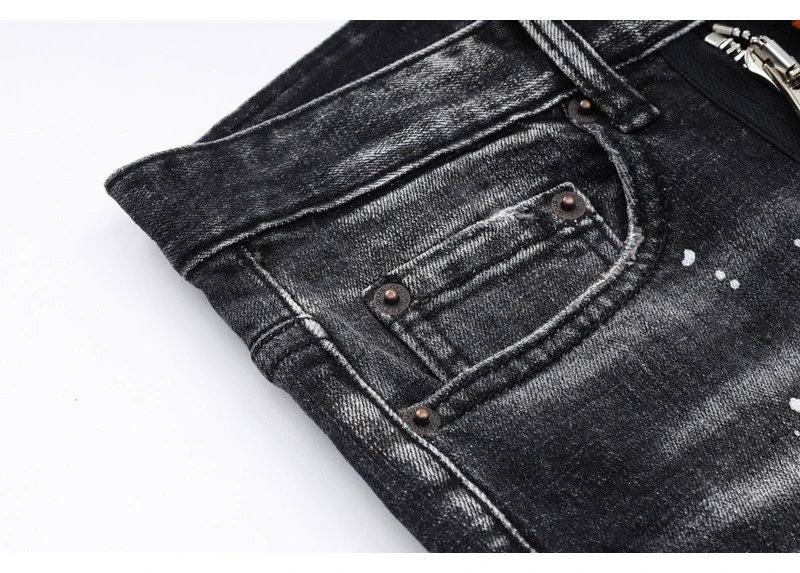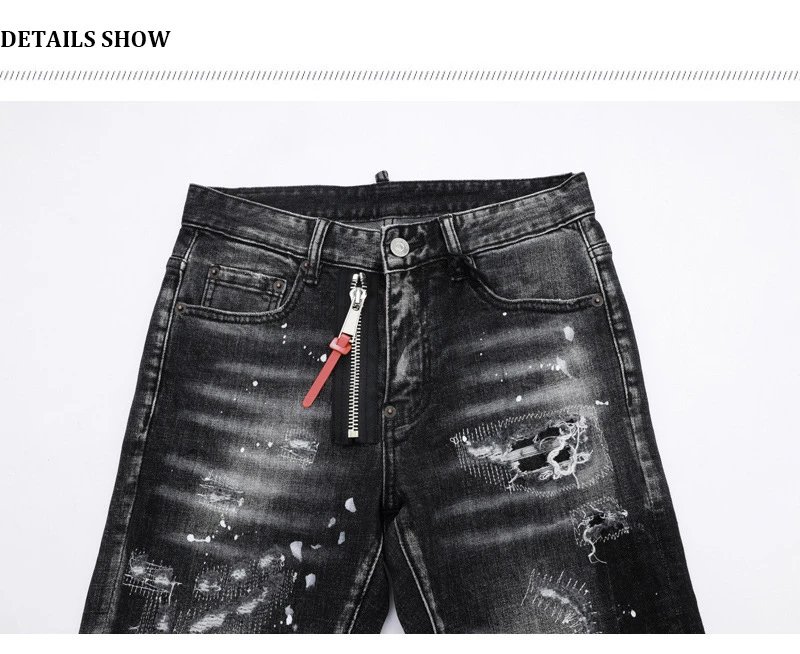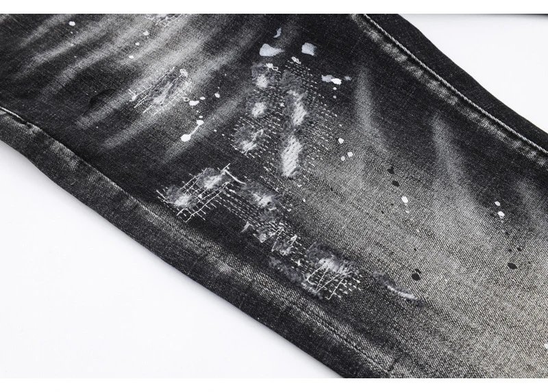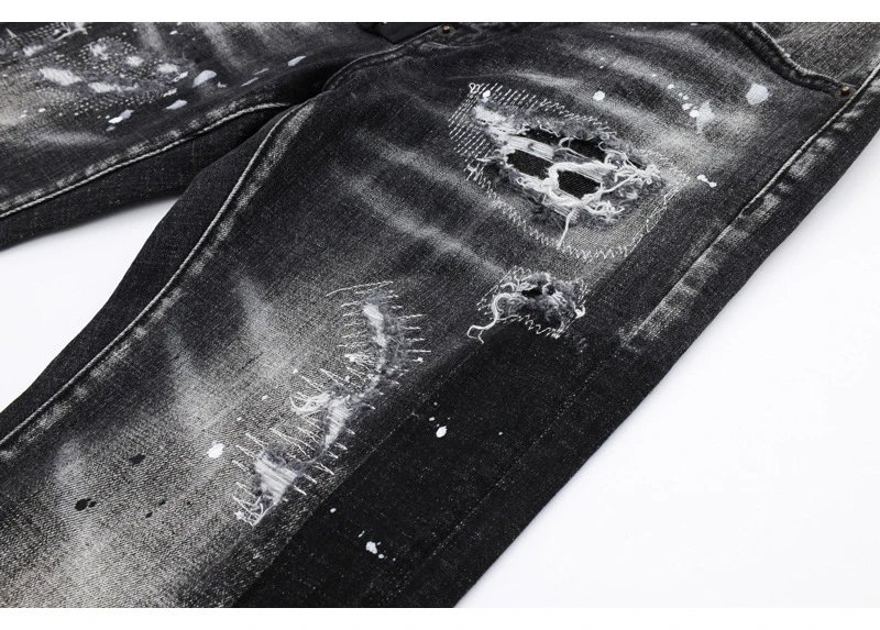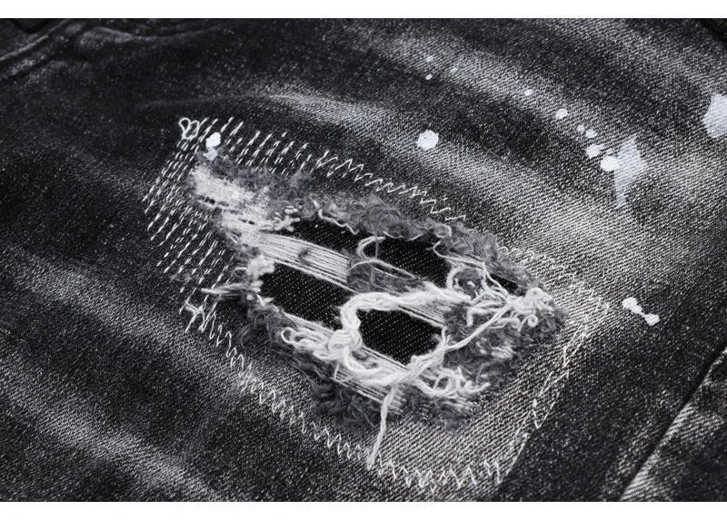 欧美街潮时尚破洞牛仔裤男潮做旧黑灰水洗油漆补丁微弹修身小脚裤
