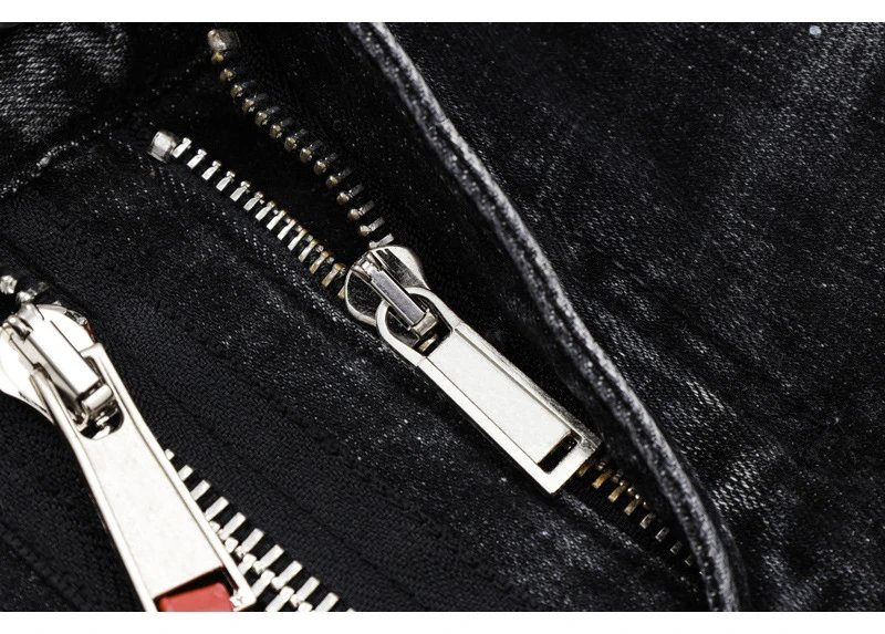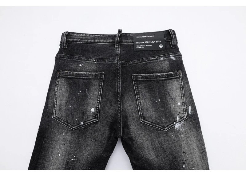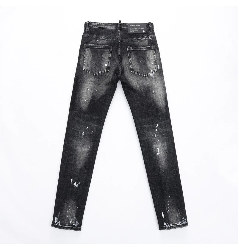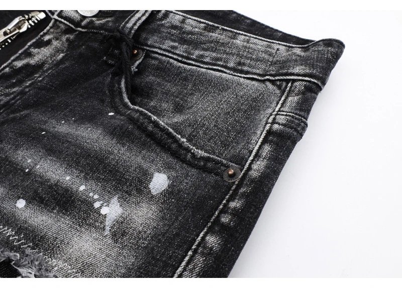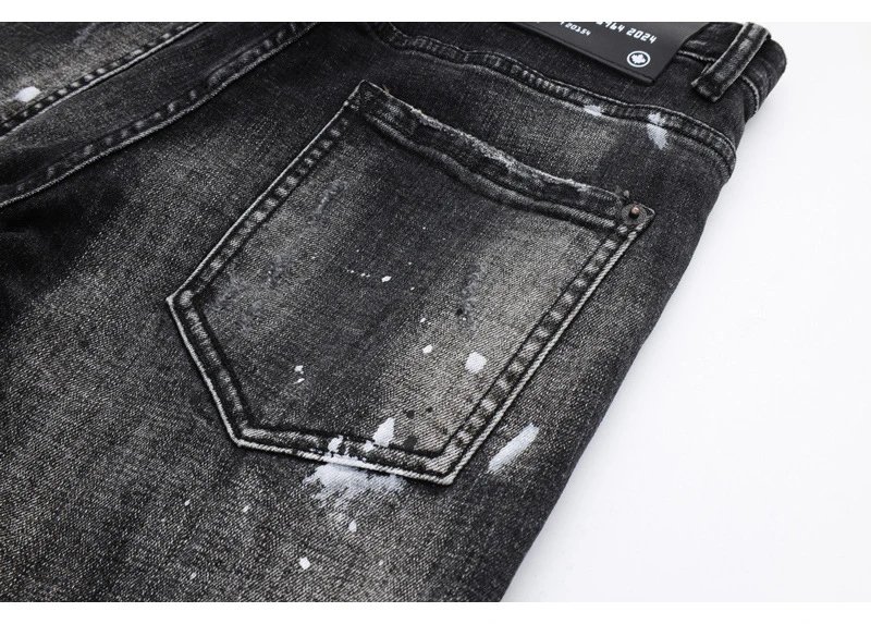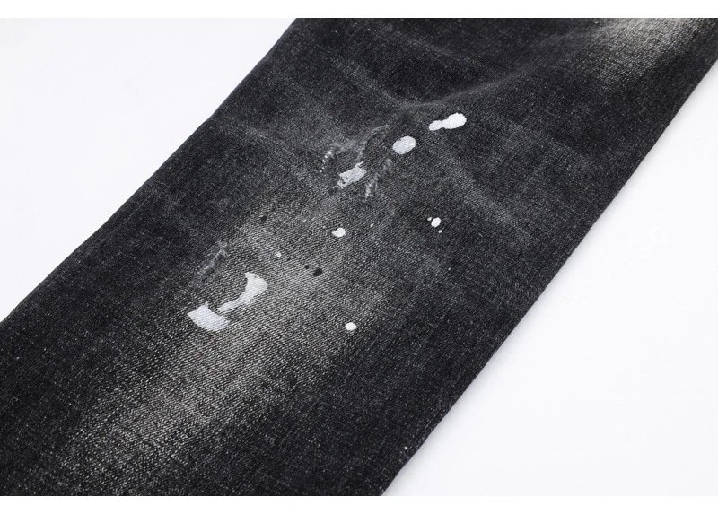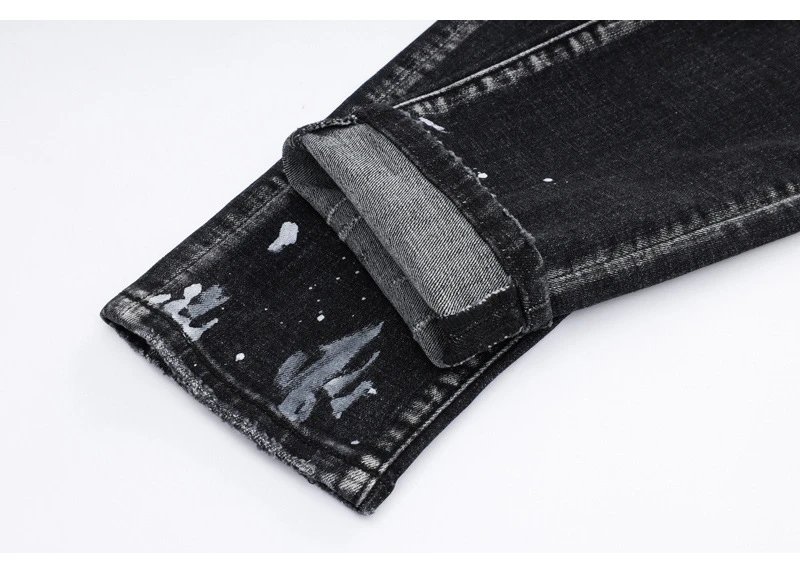 欧美街潮时尚破洞牛仔裤男潮做旧黑灰水洗油漆补丁微弹修身小脚裤